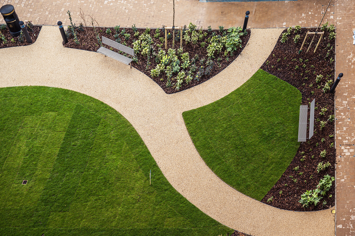The curving lines of the pathway create an elegant, abstract central feature around which beds, borders and seating are arranged. Archway Green contributed to this by carefully cutting and laying turf for the grassed areas, ensuring that the curved edges met the path exactly for a clean and defined aesthetic. They also provided maintenance post-completion to retain the grassed areas at their best. This essential to the long-term success of the turf, as discussed further in this blog.